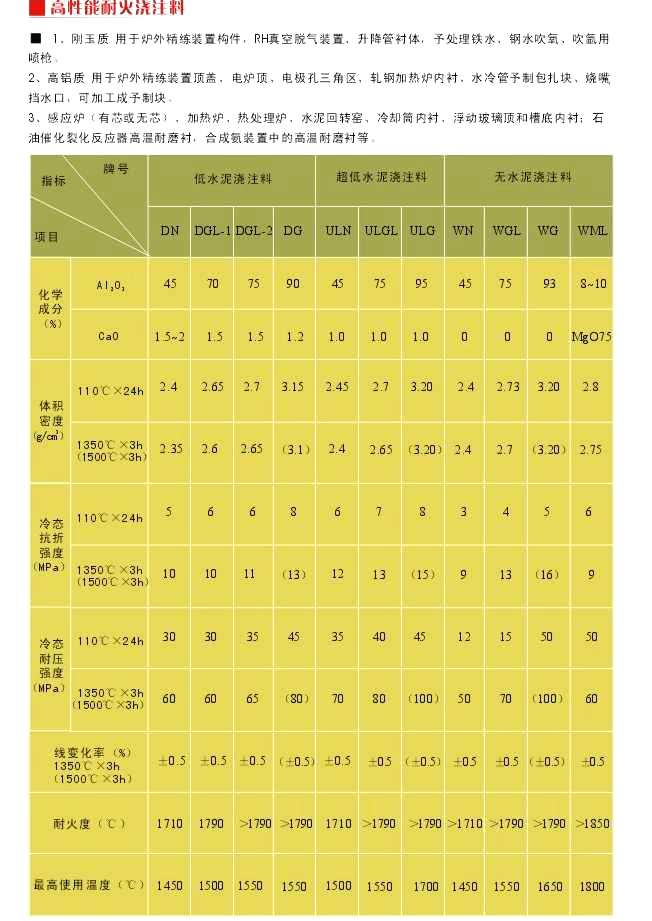 昌達(dá)耐材生產(chǎn)的低水泥澆注料、超低或無水泥澆注料用與主材質(zhì)化學(xué)成分相同或相近的超微粉取代大部分或者全部水泥,精致、科學(xué)運(yùn)用優(yōu)化顆粒級(jí)配、微粉、顆粒形態(tài)等因素,同時(shí)加入微量的分散劑(減水劑)及適量緩凝劑等復(fù)合外加劑配制而成。低水泥澆注料主要用于冶金、電力、有色、石化、建材等行業(yè)。如玻璃窯槽底、水泥窯前后窯門罩冷卻機(jī)前端等耐高溫部位、前后窯口、噴煤管等;加熱爐、均熱爐等各種熱處理爐;中頻感應(yīng)爐內(nèi)襯、石油化工催化裂化反應(yīng)器的高溫耐磨襯里、其它工業(yè)爐窯襯里。可采用現(xiàn)場(chǎng)澆注、涂抹和搗打的施工方式。